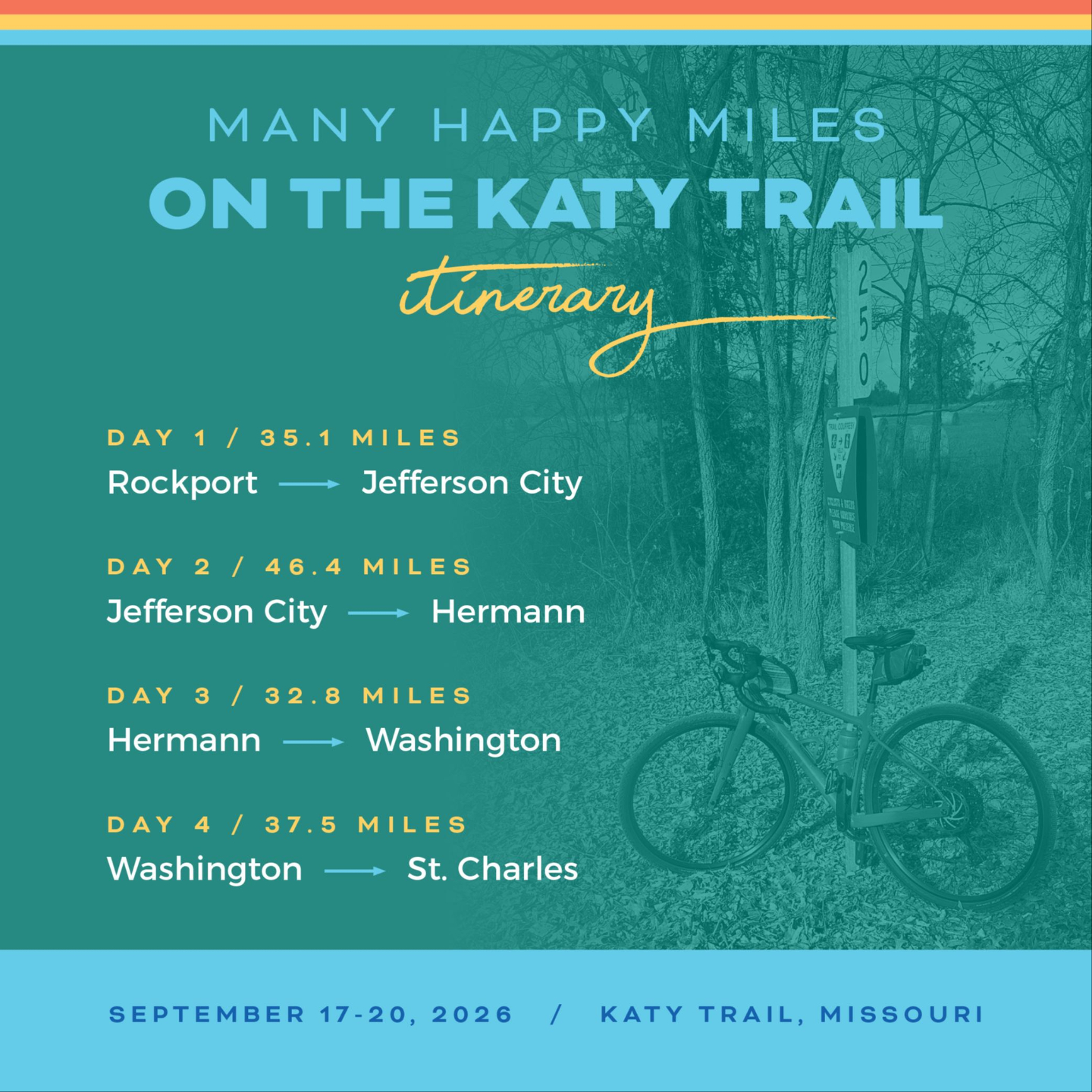 Over four days, we'll have a two-wheeled adventure, covering approximately 160 miles along the Katy Trail, the longest developed rail-trail in the U.S.
