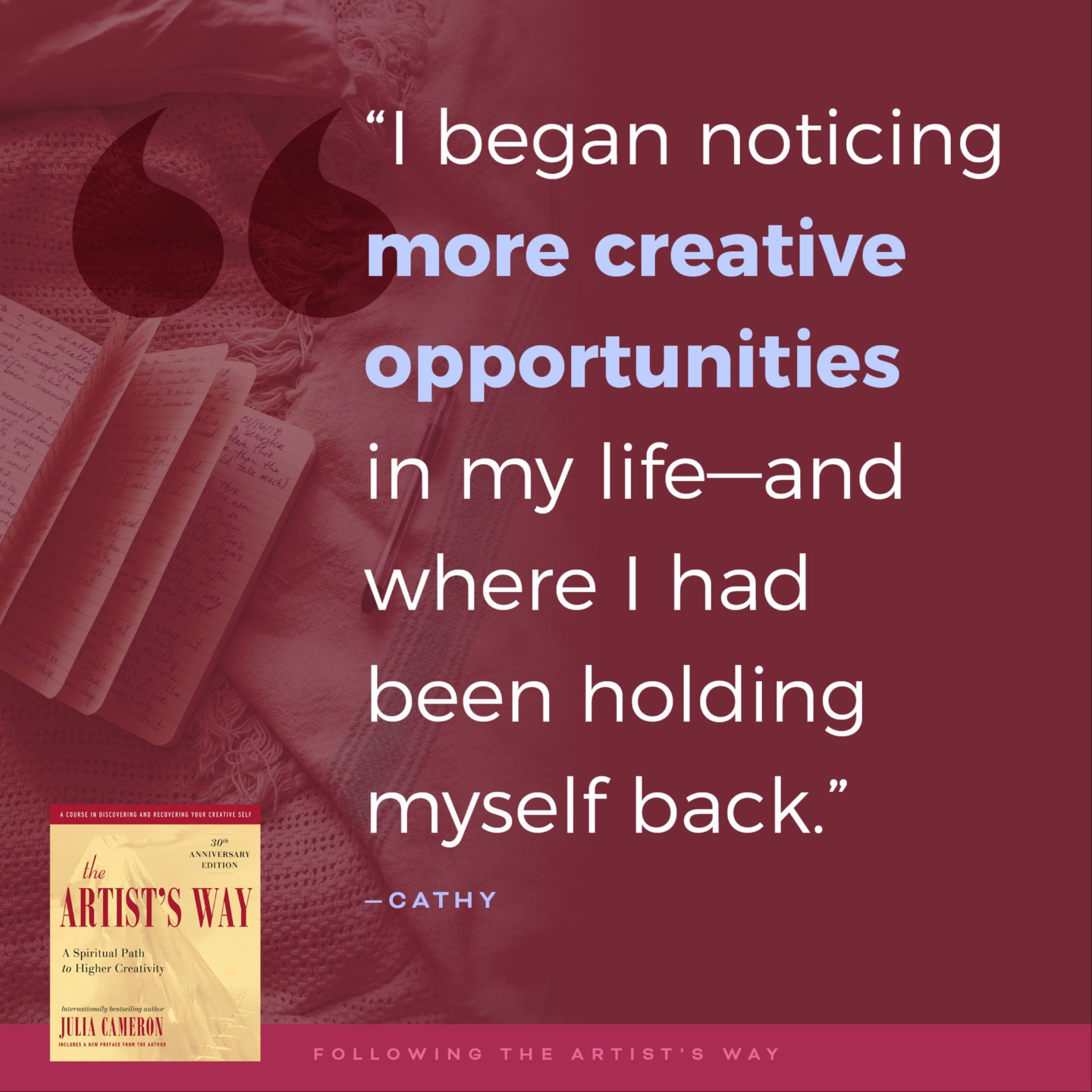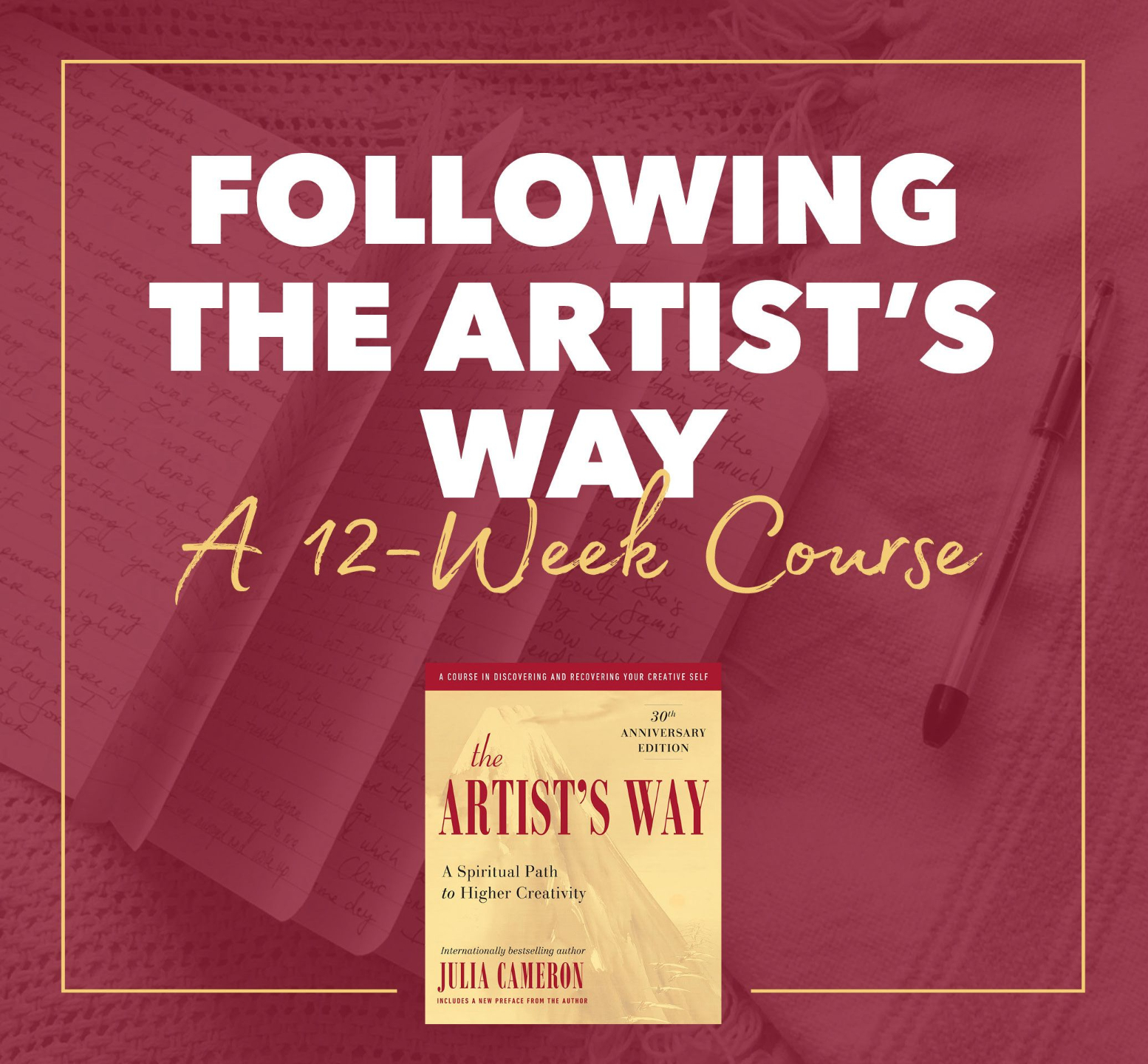 Over 12 weeks, we’ll explore one chapter at a time, supported by Morning Pages, Artist’s Dates, and a small, safe group. Together, you’ll uncover your creative, authentic self, one page at a time.
